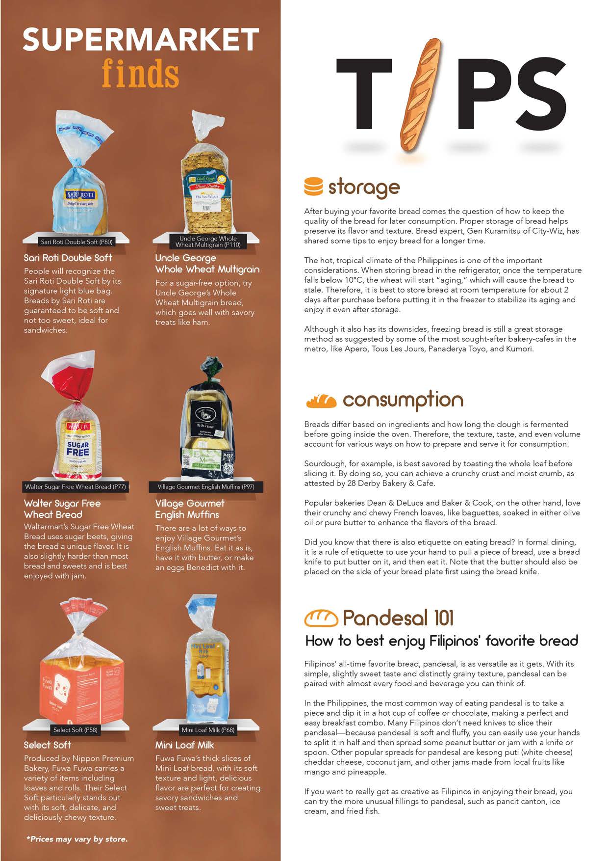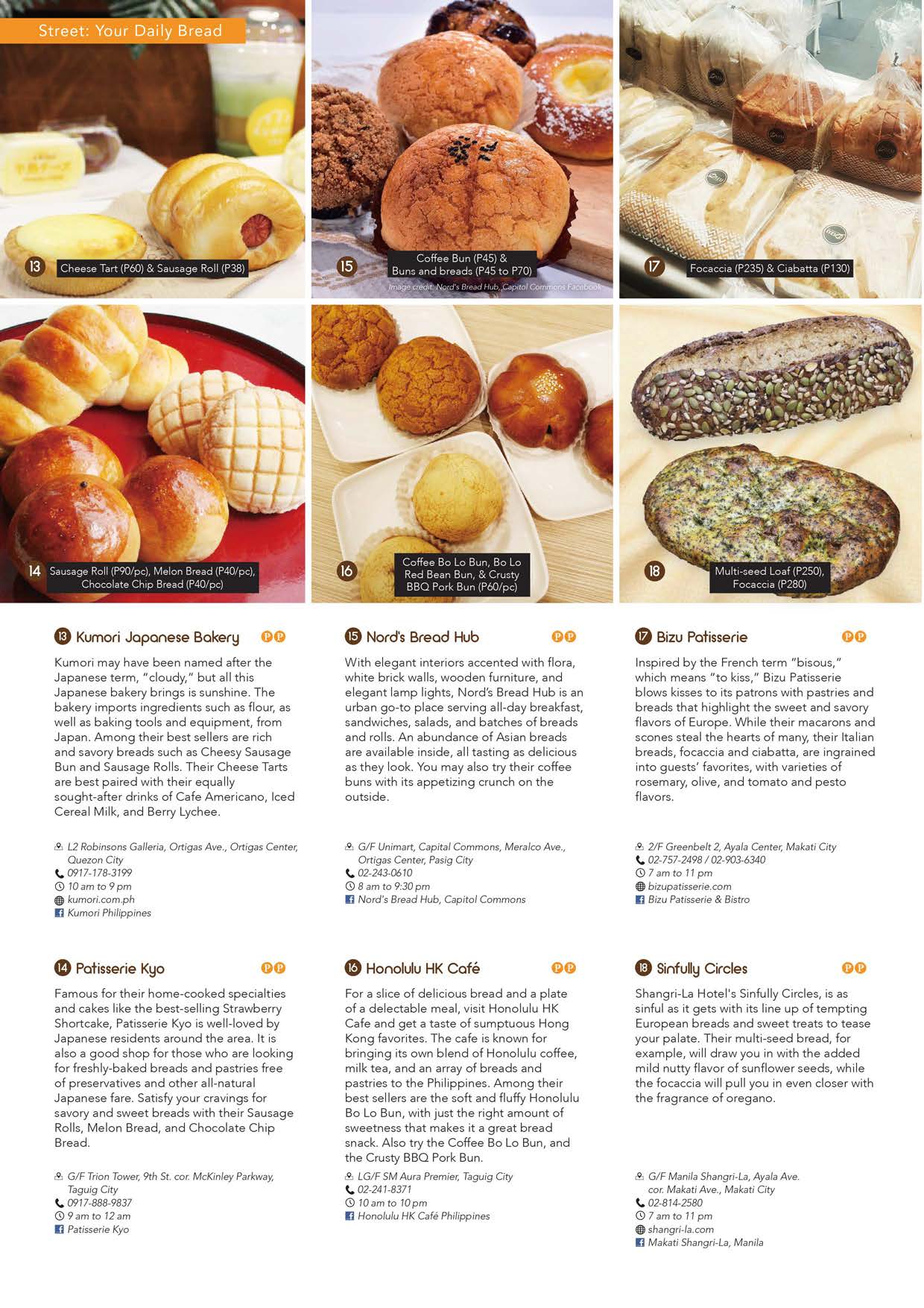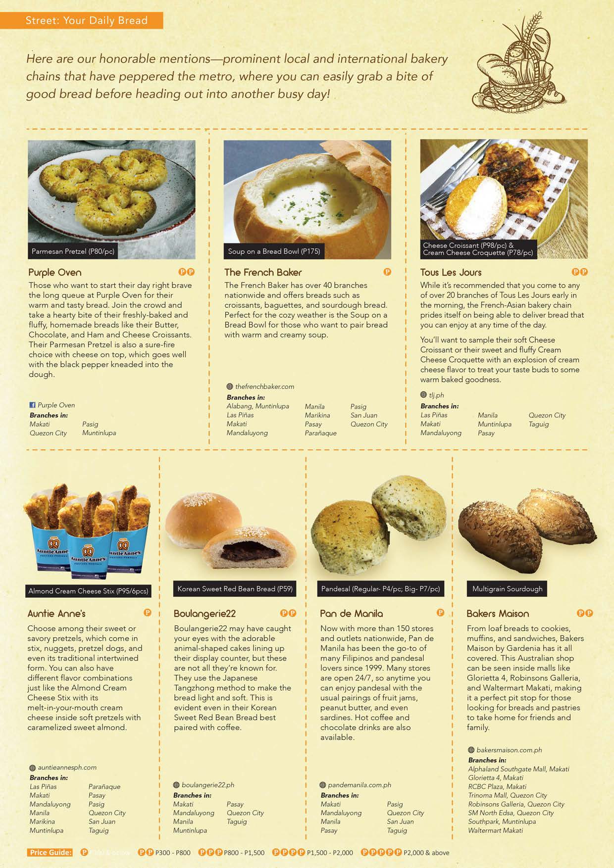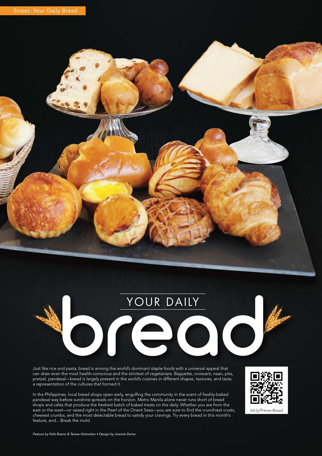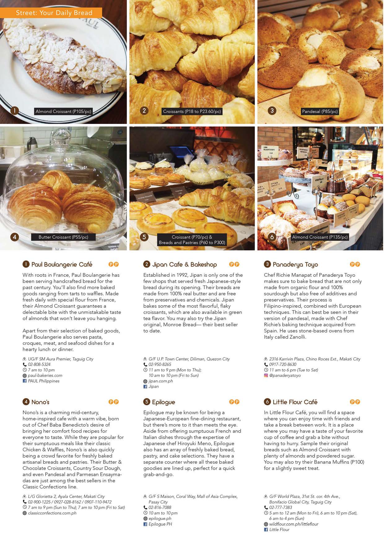 STREET-We gives you this day a guide to your daily bread in the metro-this month’s Street feature is dedicated to those of us who cannot last a day without some good bread. The heavens have indeed blessed Metro Manila with a multitude of gourmet bread shops and bakeries that have gone beyond just serving good bread-they also offer coffee, meals and spreads to enjoy with your baked goodies. Croissant, sourdough, baguette, Cronut, Danish, sweet bread, pandesal, you name it and they got it! Plus, we give you tips on how to eat and preserve your favorite baked goodies, especially the creative ways you can enjoy the ultimate local favorite, pandesal!