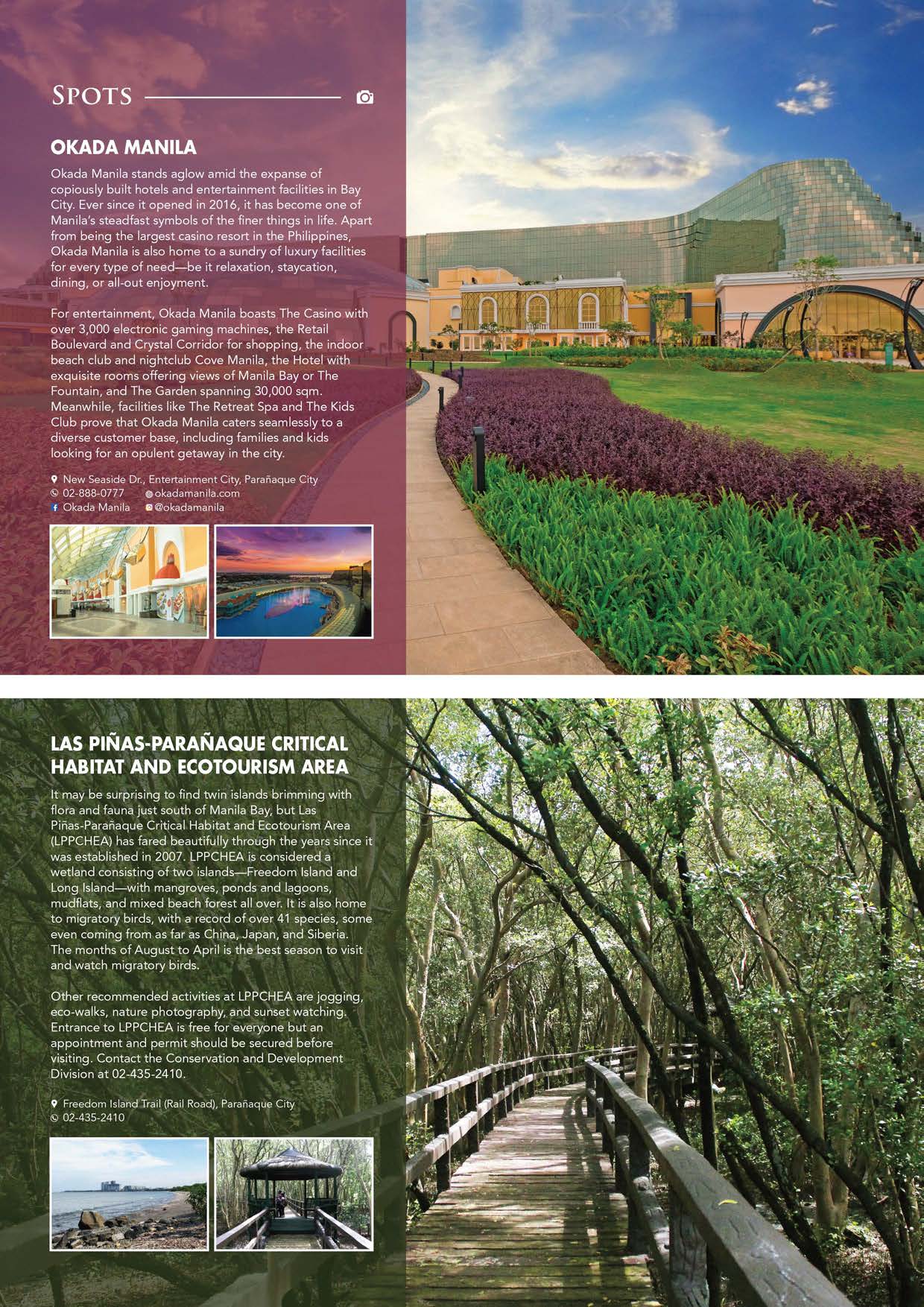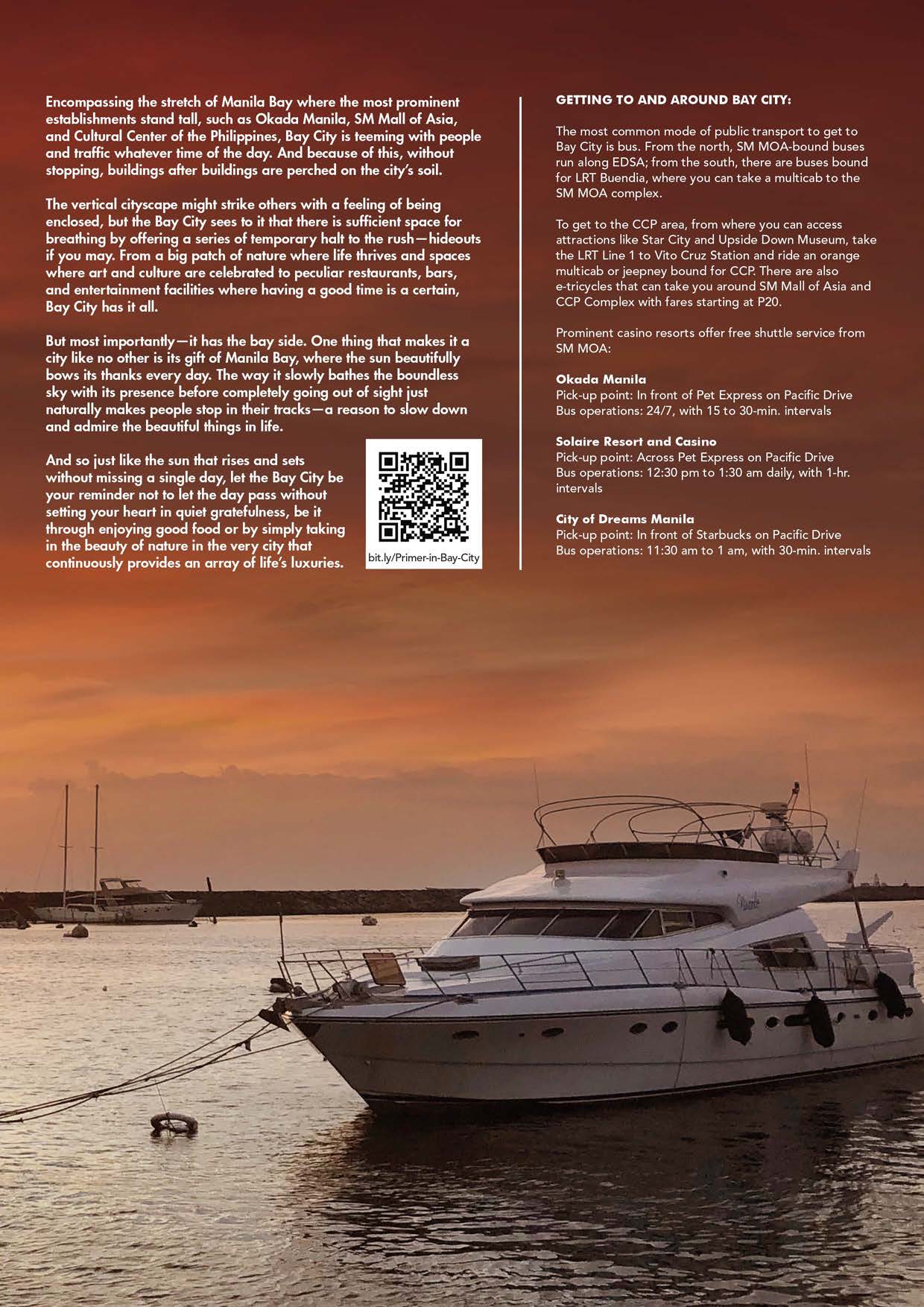 COVER- More than just a home to the most prominent entertainment resorts, shopping centers, cultural centers, and event venues in Metro Manila, Bay City is also a sanctuary that offers city dwellers a temporary pause to their usual busy day. From a big patch of nature where biological life thrives to various venues where art, culture, and entertainment converge, Bay City is a living, breathing destination fit for all members of the family. Join us as we get to know the city that perpetually looks out on Manila Bay and the most beautiful sunset in the country.