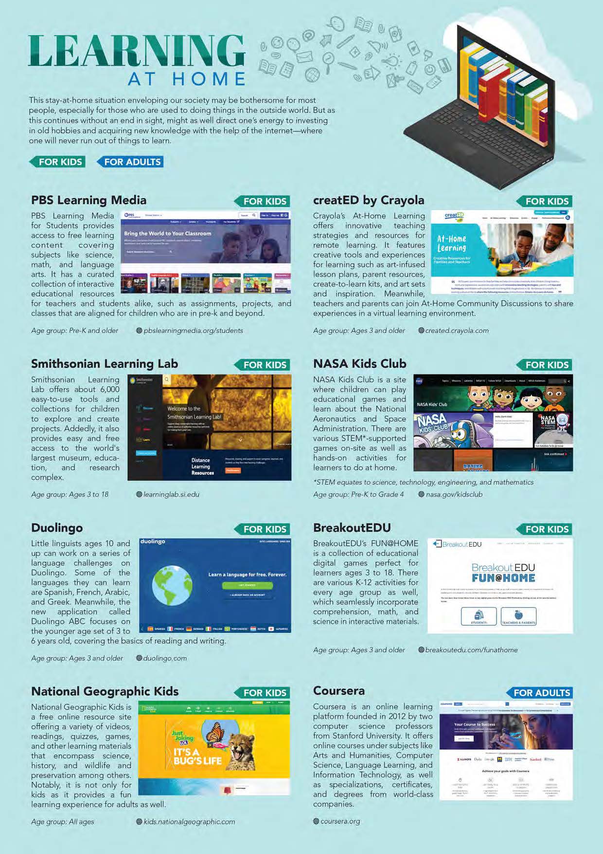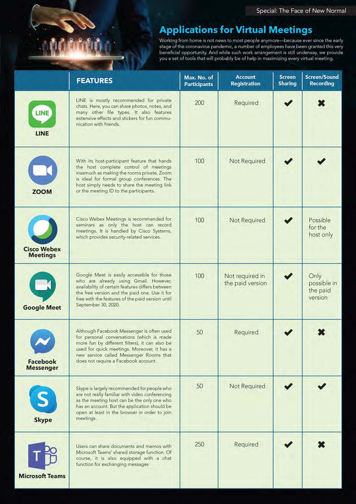 COVER – The first half of the year2020 has officially come to close – a stretch of time that was mostly spent battling and coping with a pandemic in ways disparate to one another. And now that we are in the zone of its second half, a question so demanding float’s in the air; what is possibly in store for us this time around? For the month of July, we tackle the infamous “new normal” that the world has to get by with until there’s a vaccine available, together with sets of information vital to gliding along in this situation. These cover application for virtual meetings, website’s offering lessons for kids and adults alike, as well as restaurants and grocery stores offering delivery services.