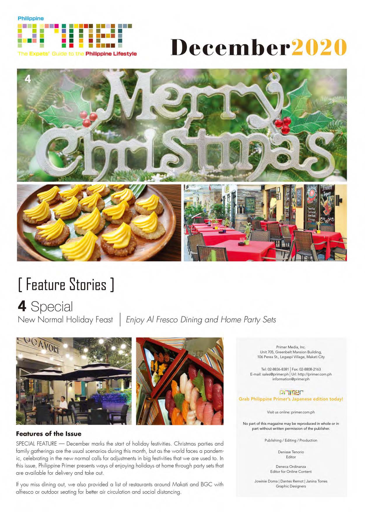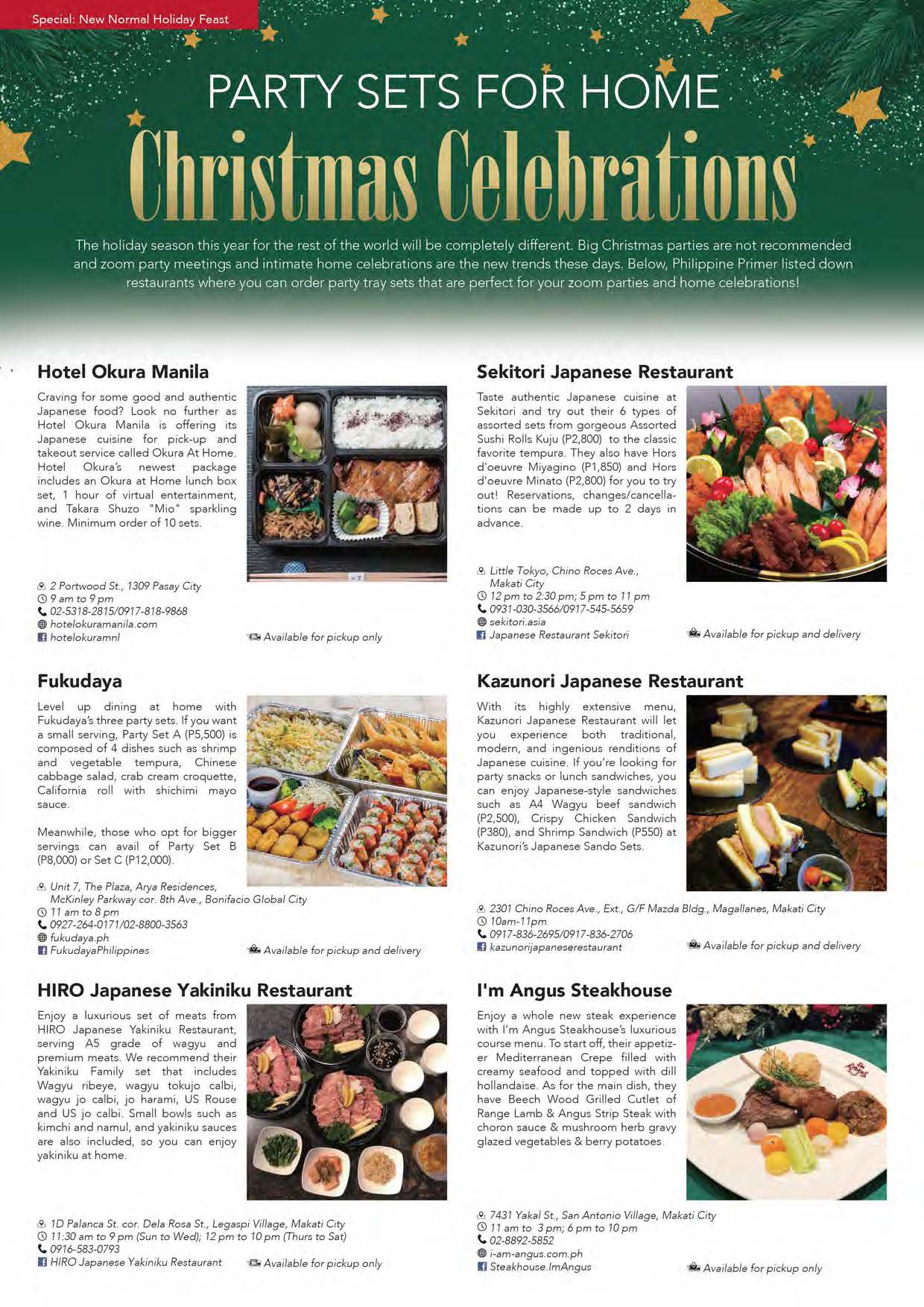 SPECIAL FEATURES- December marks the start of holiday festivities. Christmas parties and family gatherings are the usual scenarios during this month, but as the world faces a pandemic, celebrating in the new normal calls for adjustments in big festivities that we are used to. In this issue, Philippine Primer presents ways of enjoying holidays at home through party sets that are available for delivery and take out.