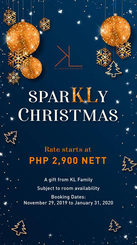 • As a Sparkly Christmas offering, KL Serviced Residences in Makati gives way for guests to enjoy the use of its facilities, bath amenities, a kitchenette complete with cookware and crockery, and a slot in the parking area by simply paying for a room-only rate starting at Php 2,900 nett!