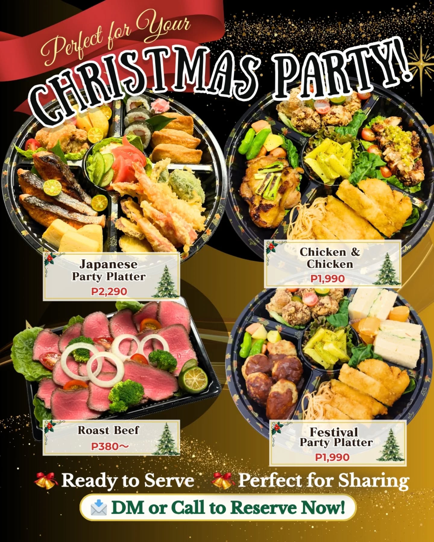 Guests can choose from the Japanese Party Platter (Php 2,290), which offers a vibrant selection of sushi rolls, inari, and colorful Japanese side dishes, perfect for those craving authentic flavors.