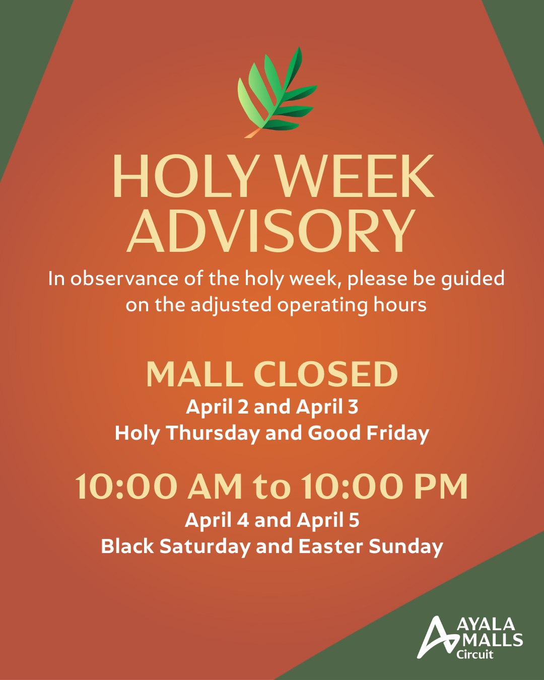 Mall operations will resume on April 4 (Black Saturday) and April 5 (Easter Sunday) from 10:00 a.m. to 10:00 p.m.