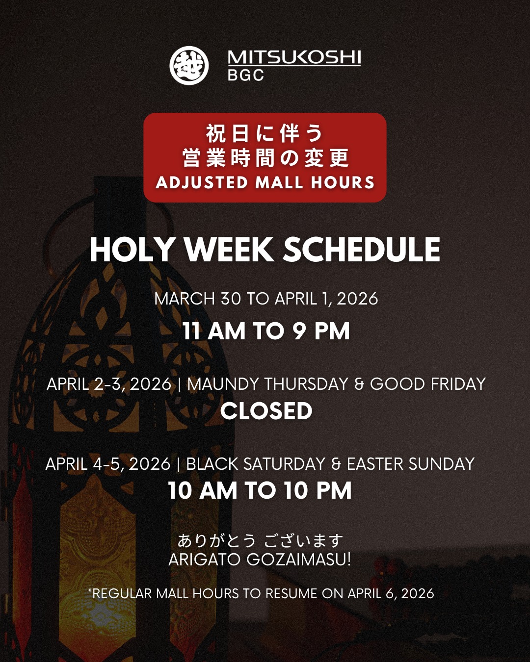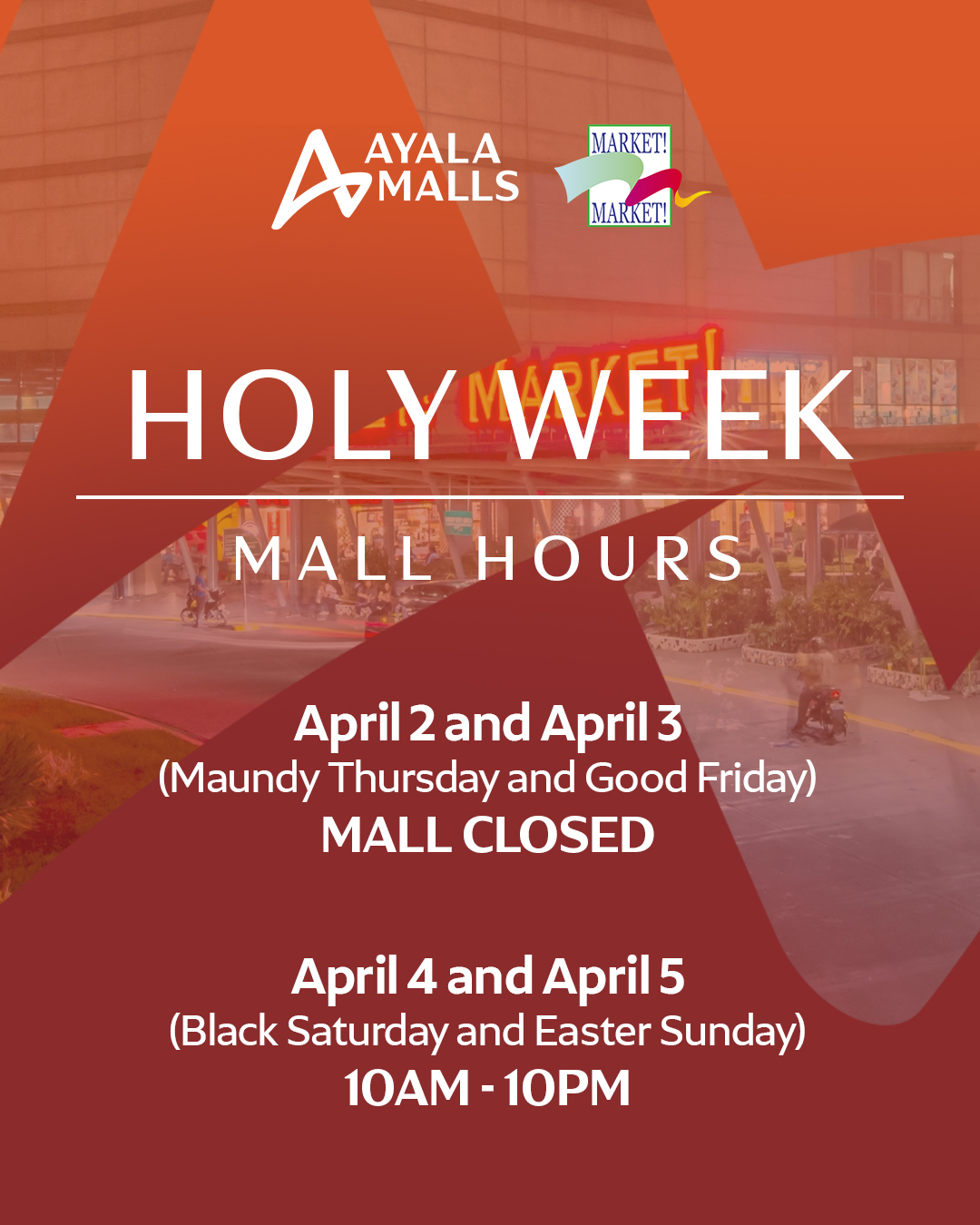 Mall operations will resume on April 4 and 5 (Black Saturday and Easter Sunday) from 10:00 a.m. to 10:00 p.m.