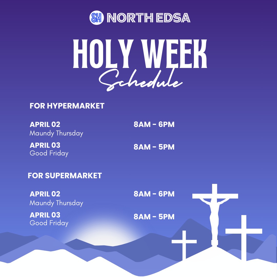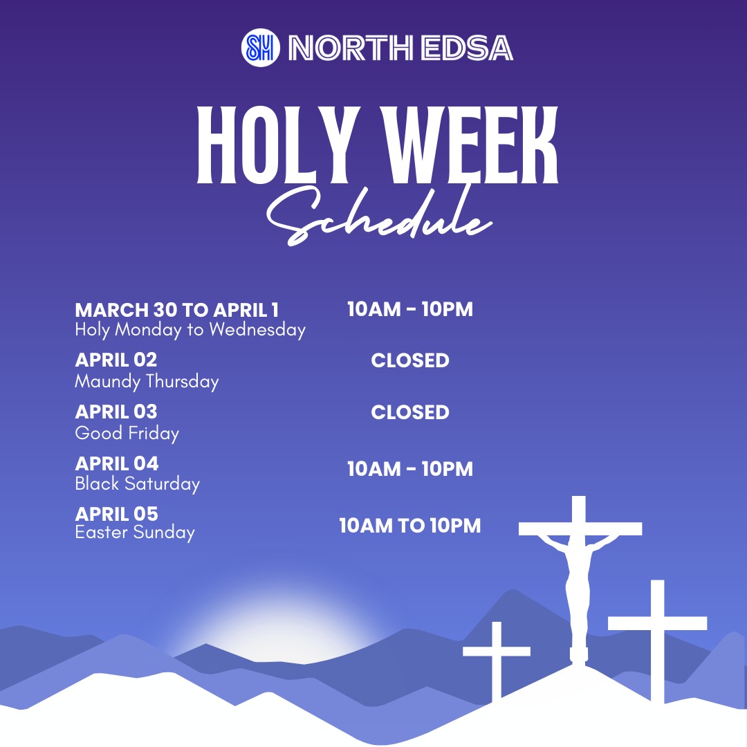SM North EDSA will operate from March 30 to April 1 (Holy Monday to Holy Wednesday) from 10:00 a.m. to 10:00 p.m.