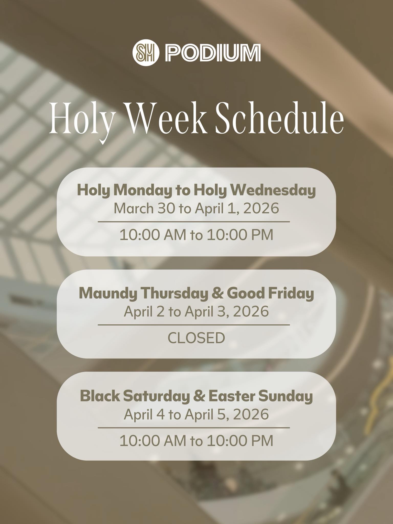 SM Podium will operate from March 30 to April 1 (Holy Monday to Holy Wednesday) from 10:00 a.m. to 10:00 p.m.