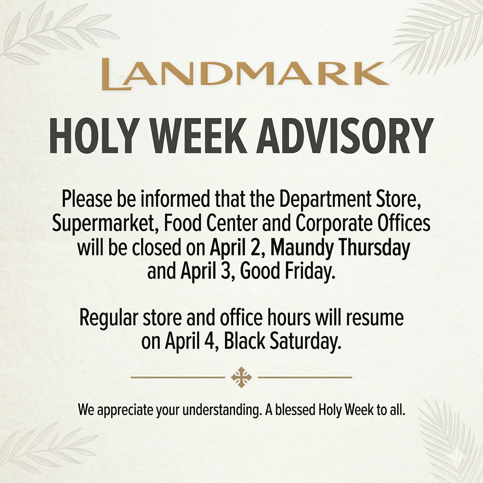 Landmark will be closed on April 2 (Maundy Thursday) and April 3 (Good Friday) in observance of Holy Week.