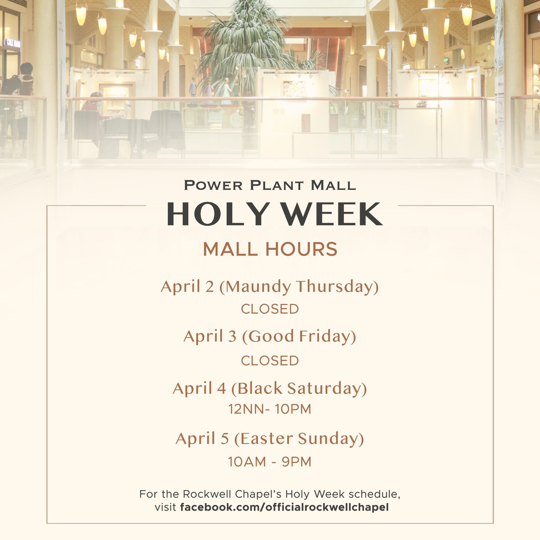 Power Plant Mall will be closed on April 2 (Maundy Thursday) and April 3 (Good Friday).