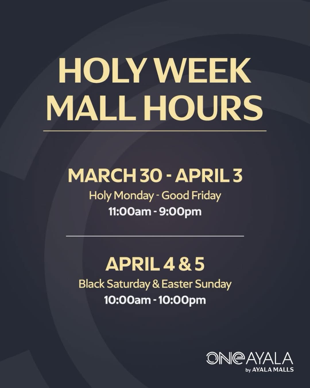 One Ayala will be closed on April 2 (Maundy Thursday) and April 3 (Good Friday) in observance of Holy Week.