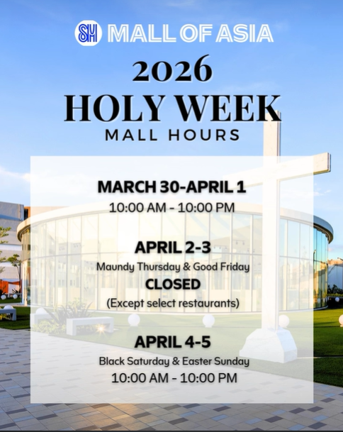 SM Mall of Asia will operate from March 30 to April 1 (Holy Monday to Holy Wednesday) from 10:00 a.m. to 10:00 p.m.