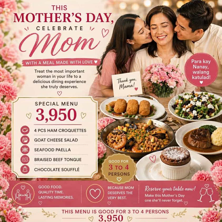 The set includes four pieces of Ham Croquettes, Goat Cheese Salad, Seafood Paella, Braised Beef Tongue, and Chocolate Soufflé for a sweet ending. With its comforting Spanish flavors and celebratory spread, Manduca Taberna offers a lovely way to make Nanay feel appreciated on her special day.