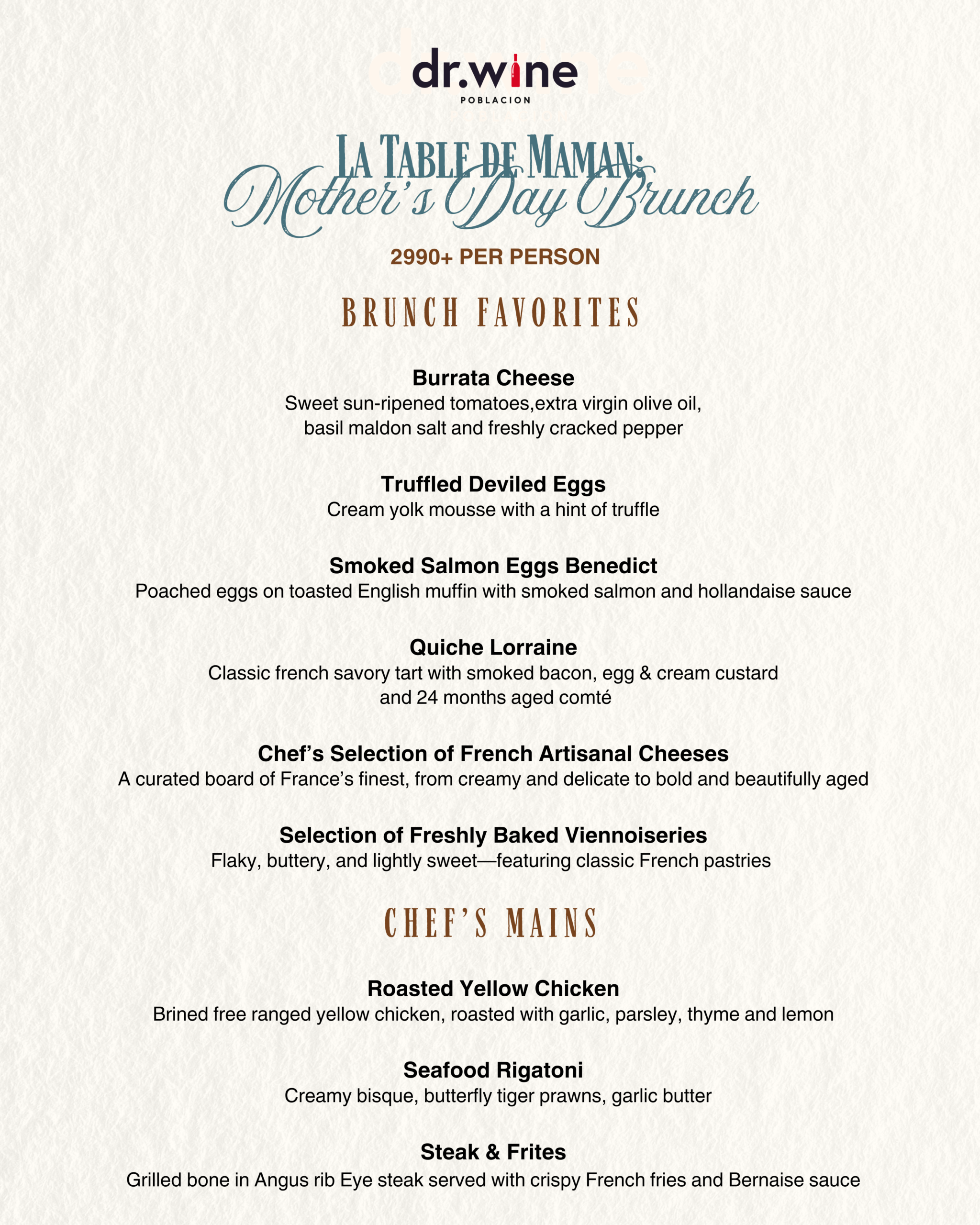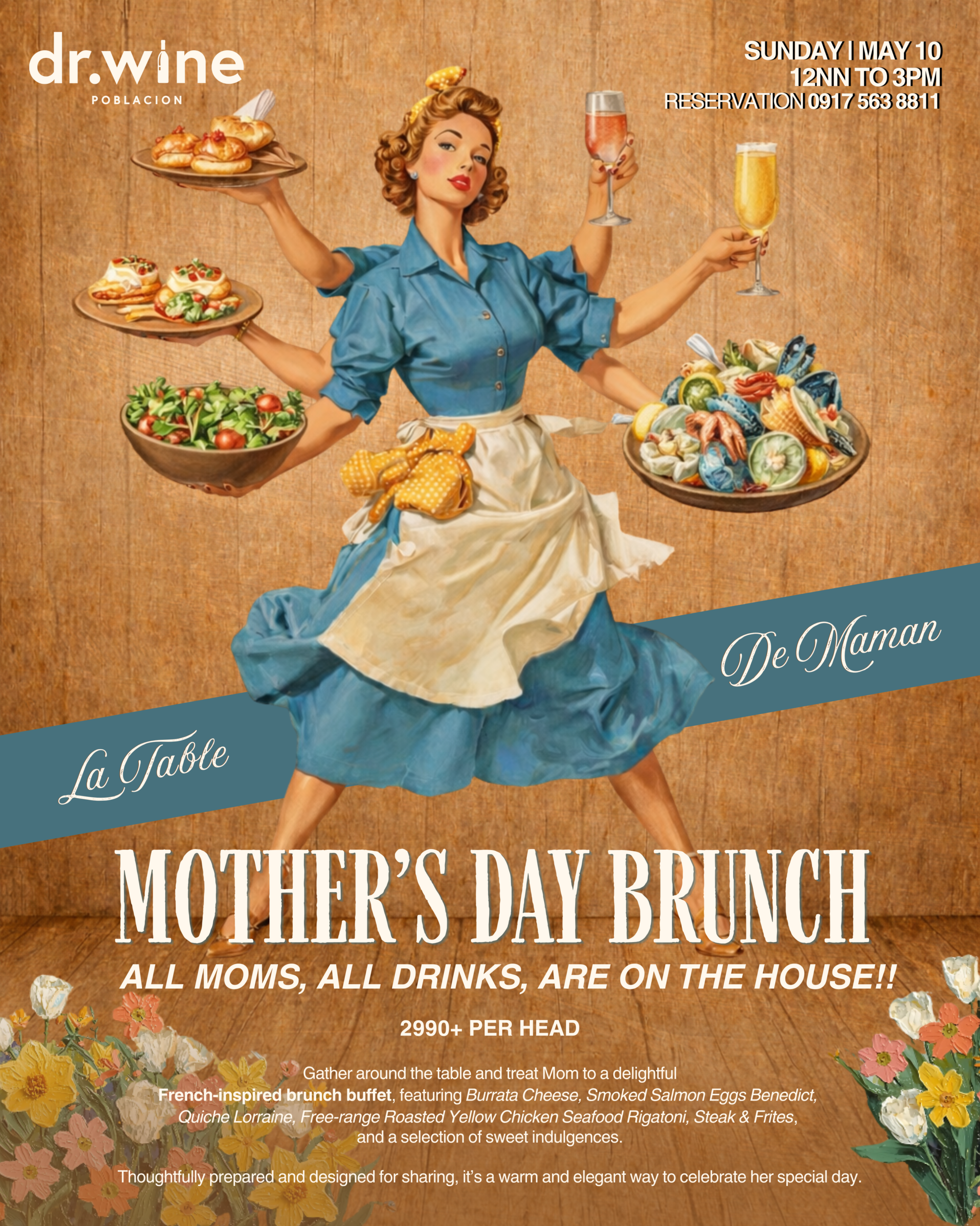 Treat Mom to a French-inspired Mother’s Day Brunch at Dr. Wine Poblacion on May 10, from 12:00 p.m. to 3:00 p.m.