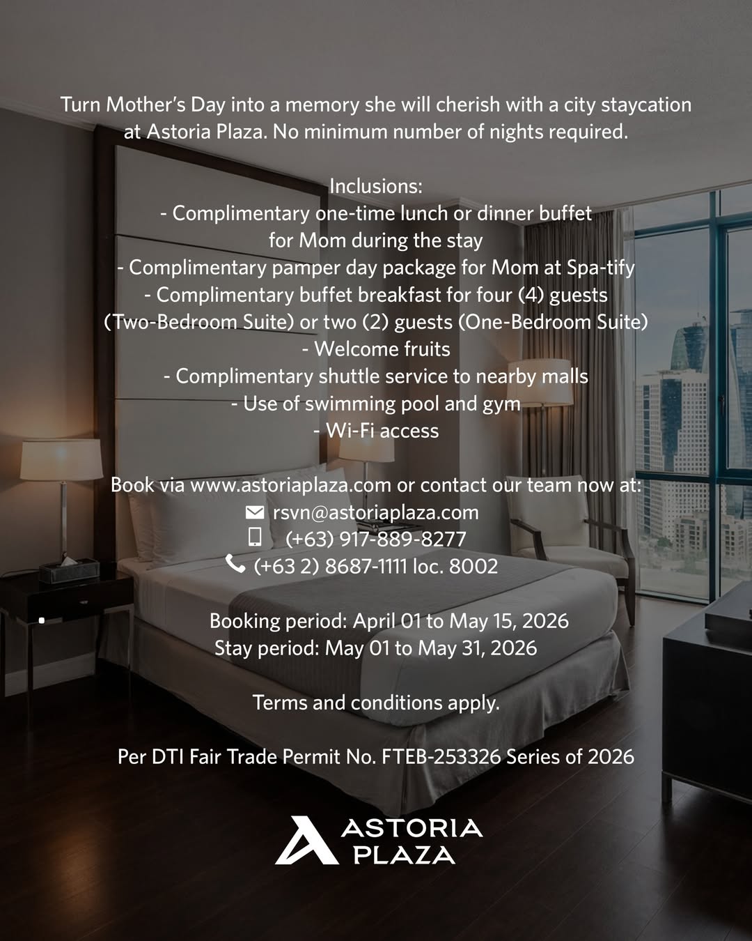 Booking is available from April 1 to May 15, 2026, for stays from May 1 to 31, 2026. For reservations, guests may visit www.astoriaplaza.com, email rsvn@astoriaplaza.com, or contact 0917-889-8277 and 02-8687-1111 loc. 8002.