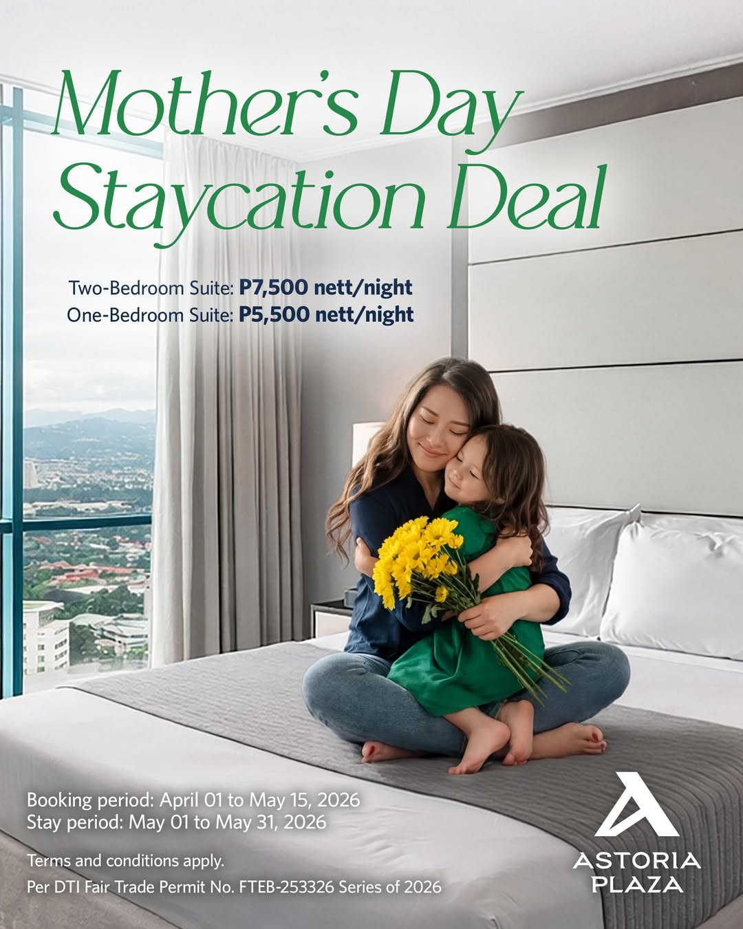 Astoria Plaza makes Mother’s Day more memorable with a city staycation deal designed to give mom a relaxing break in the heart of the metro. Guests may book a One-Bedroom Suite for Php 5,500 nett per night or a Two-Bedroom Suite for Php 7,500 nett per night, with no minimum number of nights required.