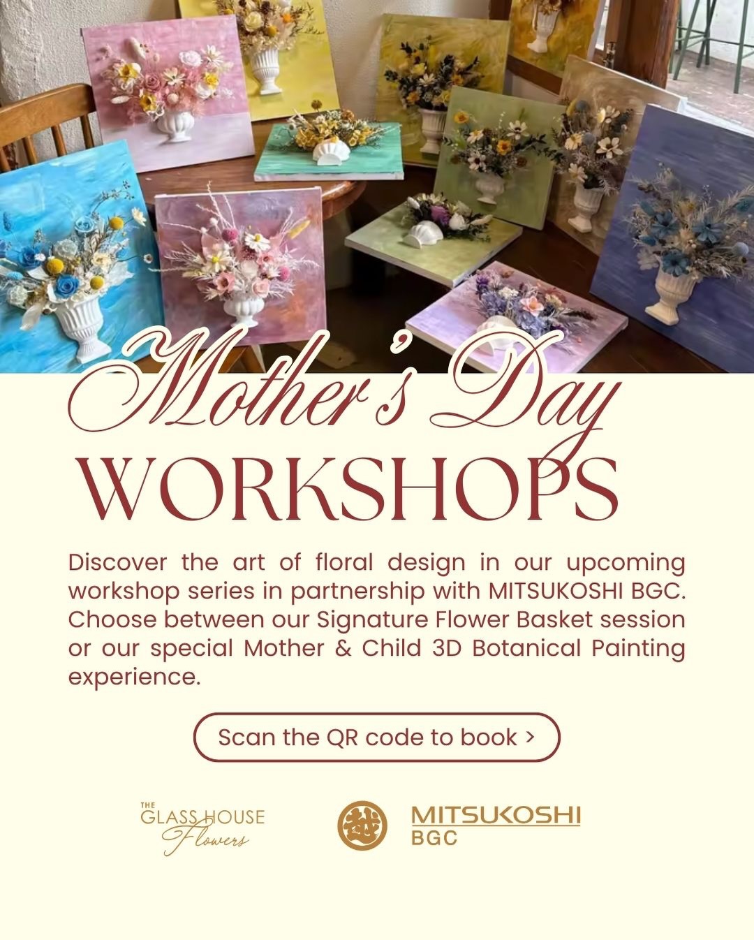 This Mother’s Day, The Glass House Flowers invites families to its pop-up studio at MITSUKOSHI BGC for a floral workshop series. Guests may choose between two sessions: the Signature Flower Basket Arrangement or the Preserved Flower 3D Painting experience.