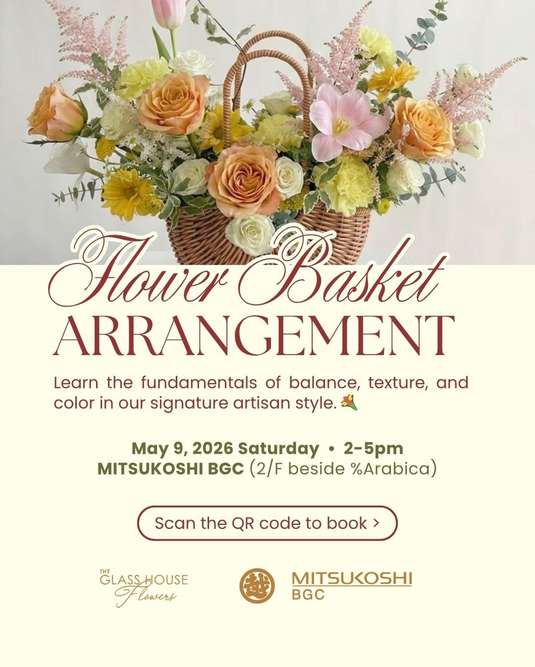 The Flower Basket Arrangement Workshop will be held on May 9, 2026, Saturday, from 2:00 p.m. to 5:00 p.m. at MITSUKOSHI BGC, 2/F beside %Arabica. In this beginner-friendly session, participants can learn the fundamentals of balance, texture, and color in The Glass House Flowers’ signature artisan style.