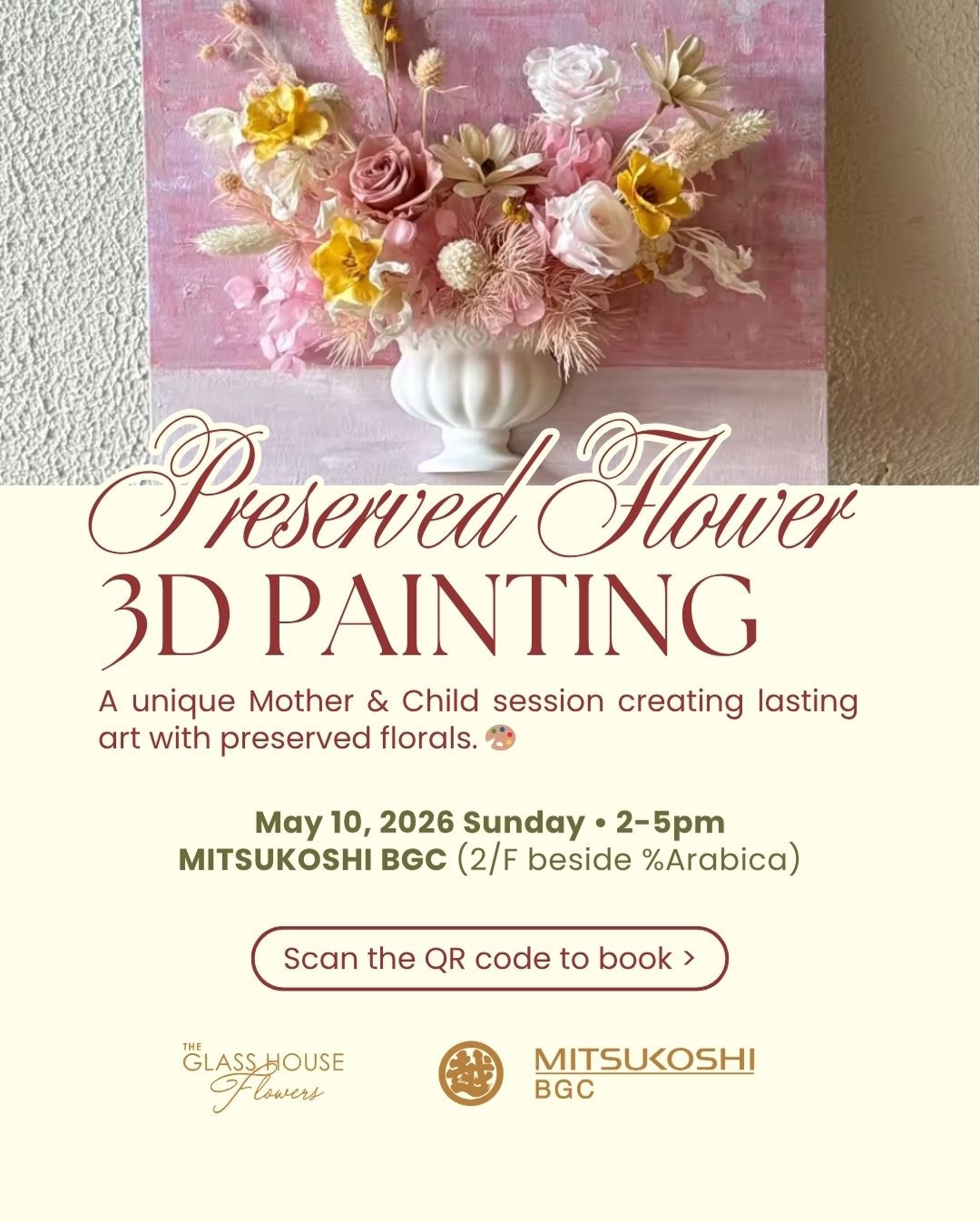 For a more sentimental bonding activity, the Preserved Flower 3D Painting session will take place on May 10, 2026, Sunday, from 2:00 p.m. to 5:00 p.m. at the same venue. Designed as a Mother & Child session, it lets participants create lasting art using preserved florals.