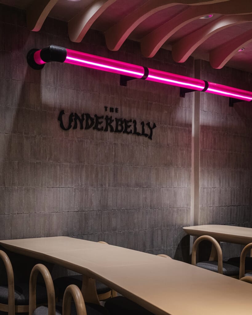 The Underbelly’s interior has smooth, curved wooden elements that create a wave-like ceiling. The muted tones of gray and beige give the place an industrial vibe, while soft, warm lighting adds a cozy yet upscale feel.