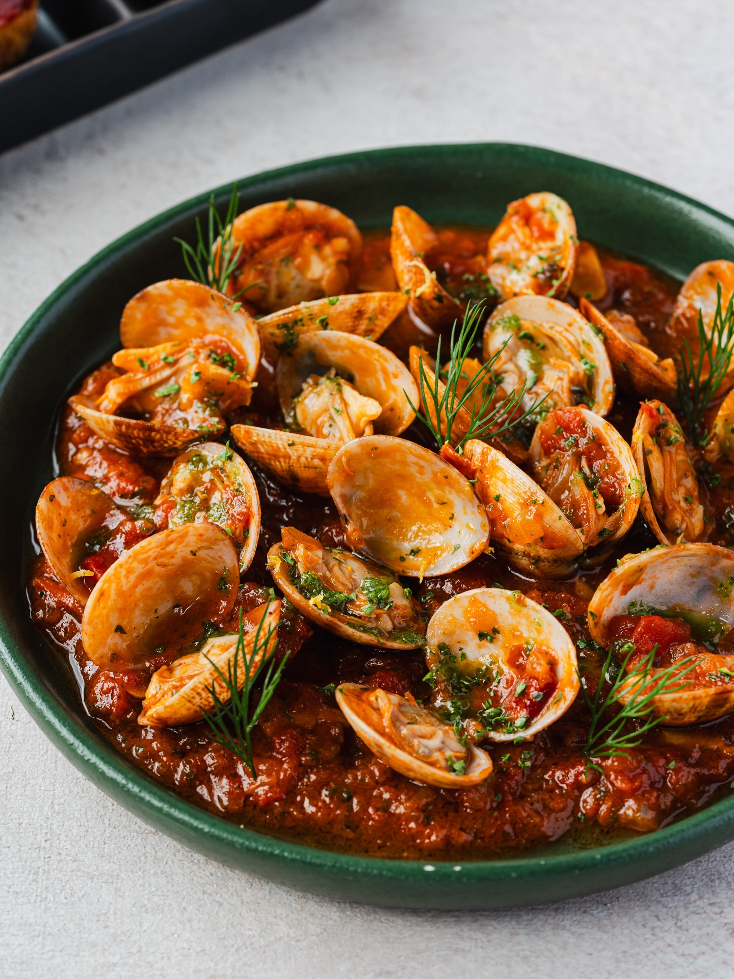 Warm and aromatic, it highlights the natural brininess of the clams while layering it with the richness of olive oil, the gentle sweetness of tomatoes, and the fragrant depth of garlic and wine.