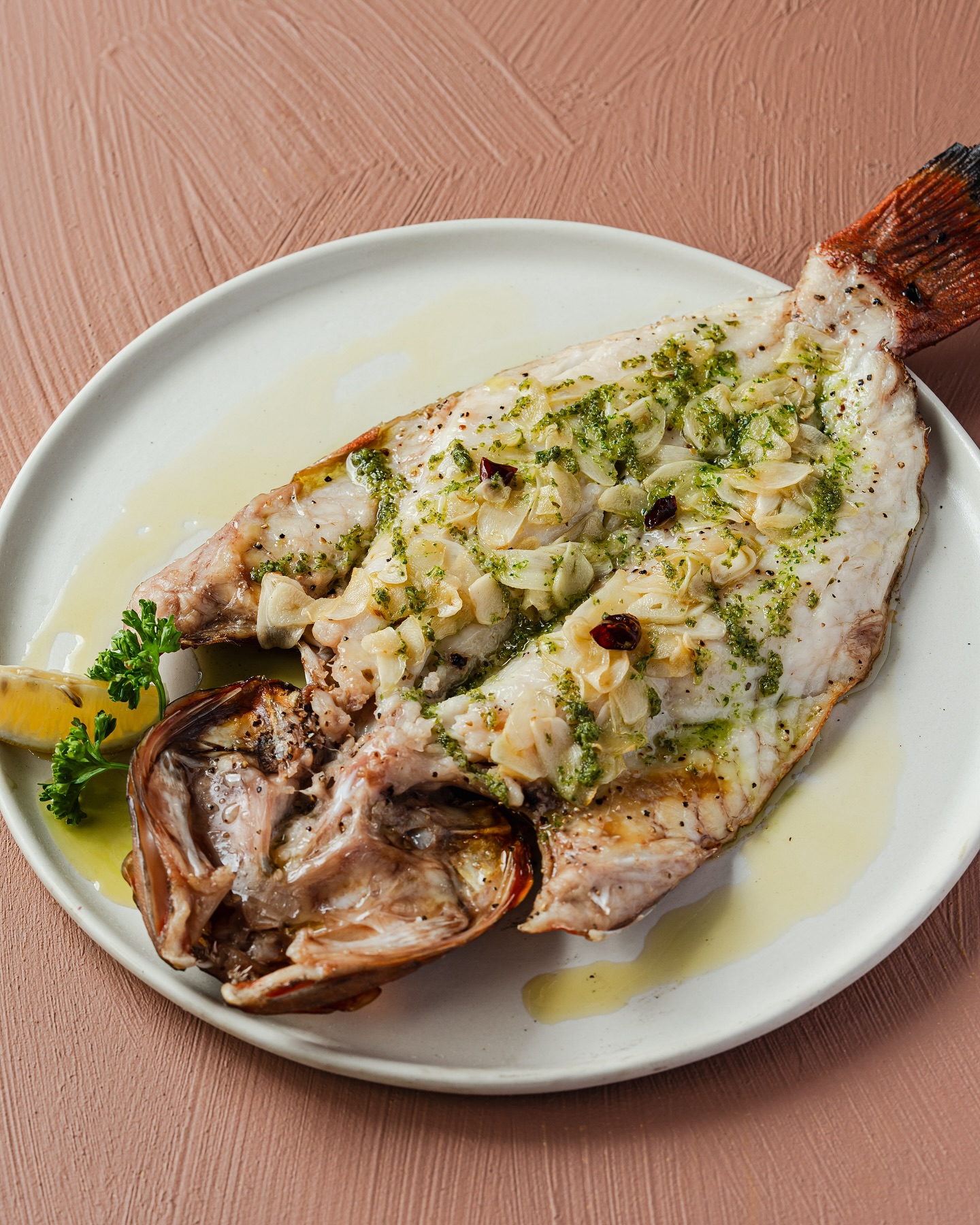 Simple in preparation yet rich in flavor, the dish allows the freshness of the fish to take center stage, while the garlic adds depth, the chili flakes bring a gentle heat, and the olive oil ties everything together with a smooth, savory finish.