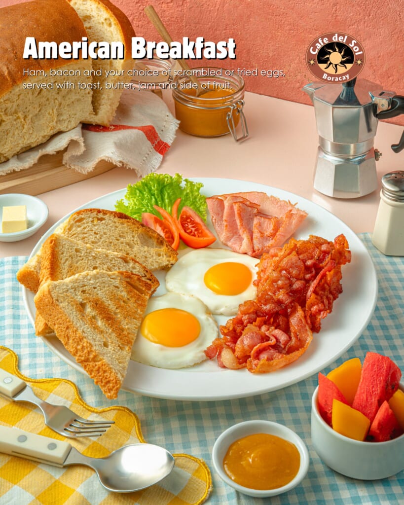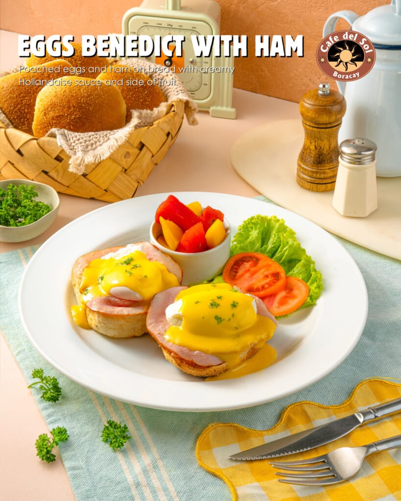 Diners may also enjoy their hearty all-day breakfast set meals, including crowd favorites like the American Breakfast—ham, bacon, eggs, toast, butter, jam, and fresh fruit—and the Eggs Benedict with Ham, topped with rich Hollandaise sauce for that perfect Boracay morning.