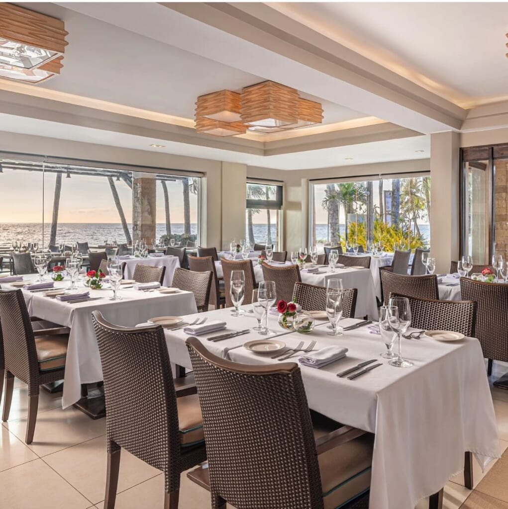 Woven rattan chairs lend a subtle tropical charm, while expansive floor-to-ceiling windows flood the space with natural light and frame breathtaking views of the ocean and swaying palms. Soft, geometric ceiling fixtures add warmth and contemporary elegance, creating an inviting atmosphere perfect for intimate dinners, leisurely meals, or simply soaking in the serene beachfront backdrop.