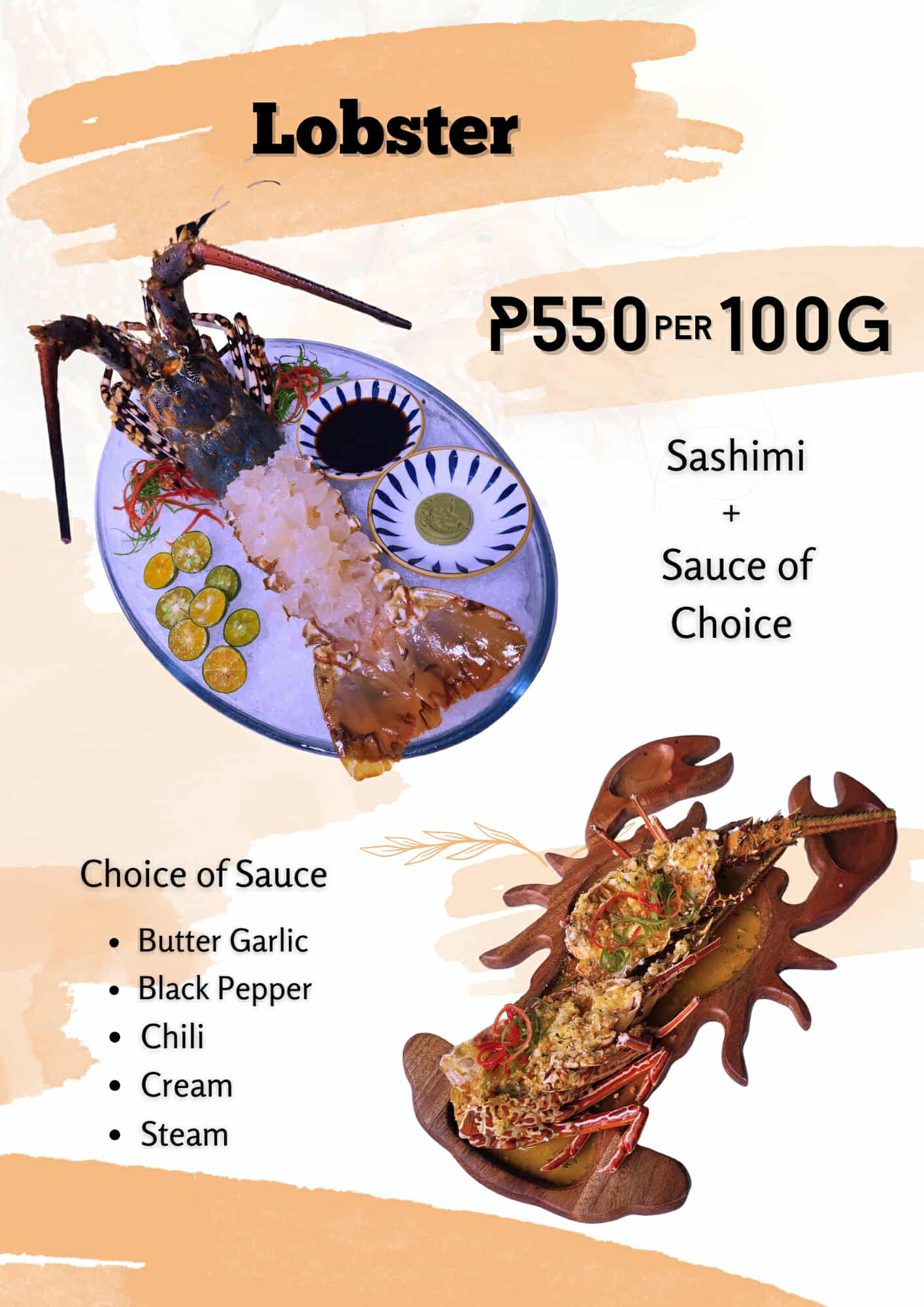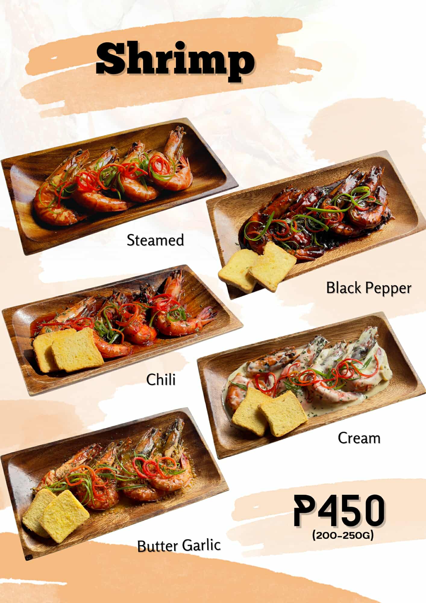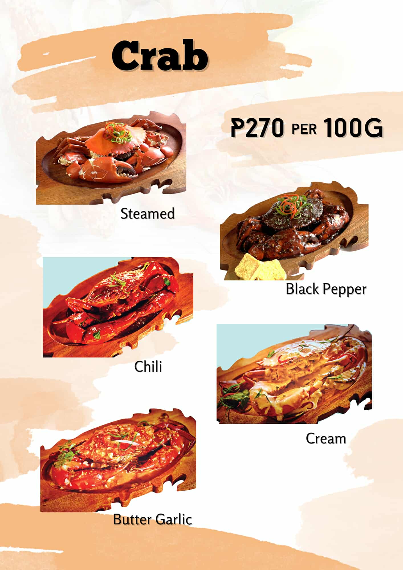 Popular favorites include Chili Crab (Php 270 per 100g), Butter Garlic Shrimp (Php 450 per 200-250g), and Lobster (Php 550 per 100g) with you choice of sauces from butter garlic, black pepper, and chili to cream and steamed. Each dish bursts with the natural sweetness of the day’s catch, complemented by house-made sauces.