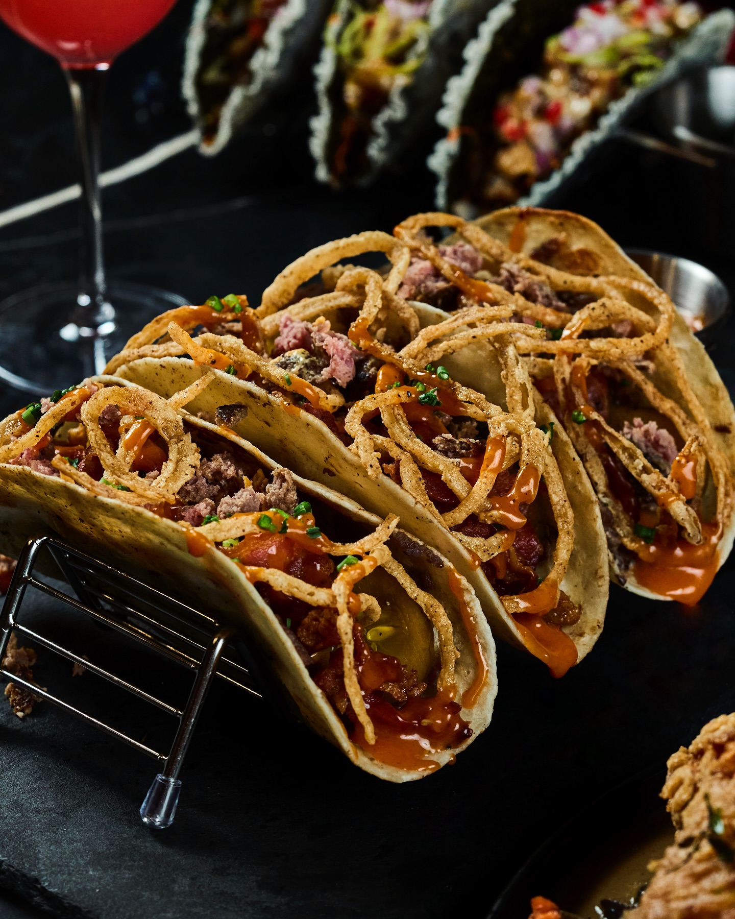 Food at Monarch Manila is just as exciting, featuring creative comfort dishes that elevate bar dining. A crowd favorite is the Smashburger Taco (Php 450)—a flavor-packed combination of smashed beef patty, bacon, American cheese, barbecue sauce, pickles, and crispy onions wrapped in taco form. Juicy, messy, and satisfying, it’s a bold fusion that perfectly matches Monarch’s playful energy.