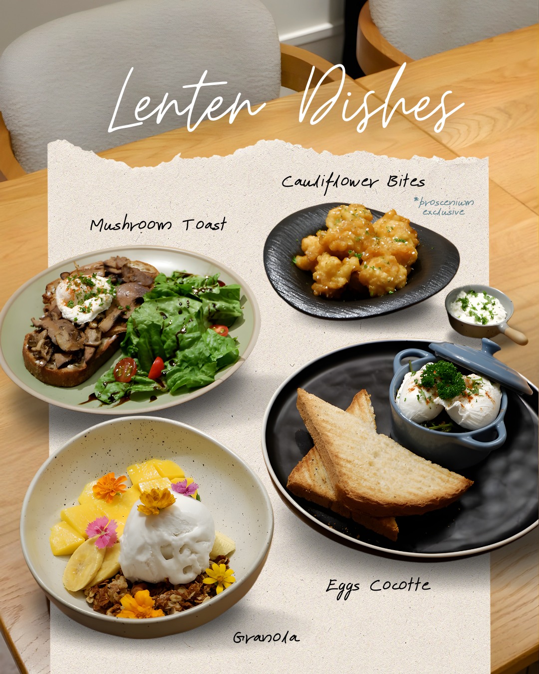 Among the seasonal offerings are the Mushroom Toast, a hearty serving of sautéed mushrooms on toast paired with fresh greens; the Eggs Cocotte, featuring soft eggs baked and served with toasted bread; and the Granola, a refreshing bowl topped with fresh fruits and yogurt. Guests visiting the Proscenium branch can also enjoy the Cauliflower Bites, a crispy plant-based dish available exclusively at the location.