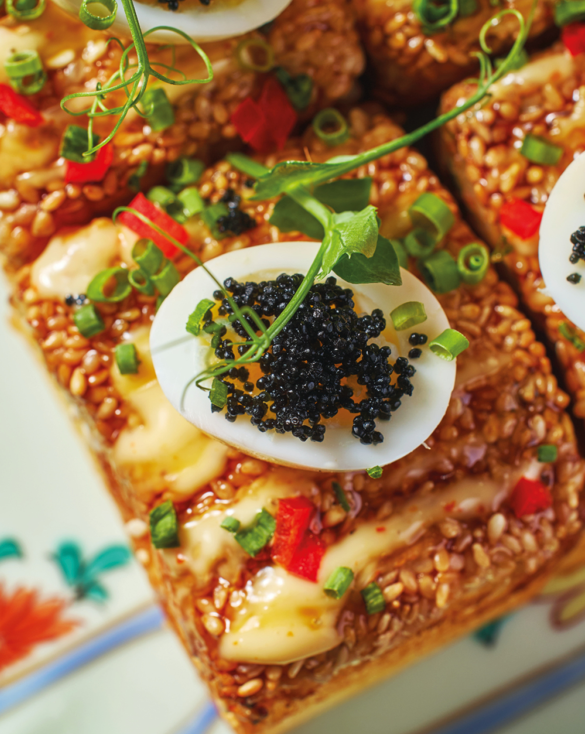 If you’re looking for a warm appetizer to begin your meal, opt for the Prawn Toast topped with smoked quail egg, citrus kewpie, kabayaki sauce, and black ebiko.