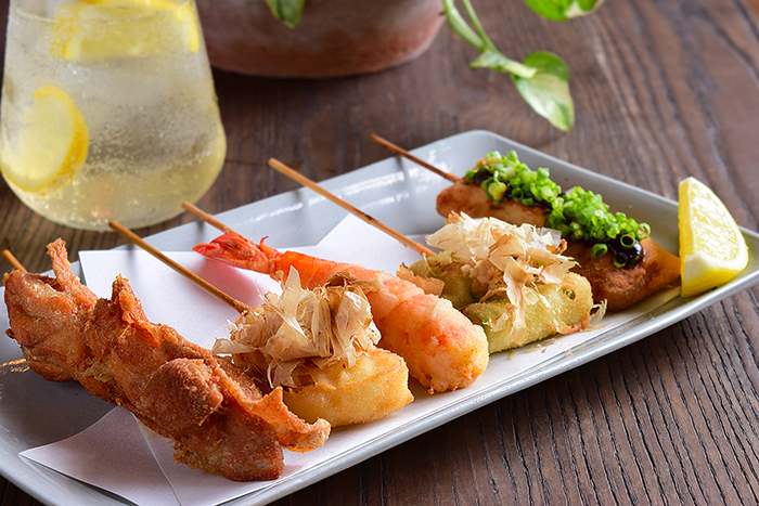 Assorted Kushikatsu (Php 450). From left to right: Chicken, Green Onion, Shrimp, Okra, Pork / IMAGE from Philippine Primer