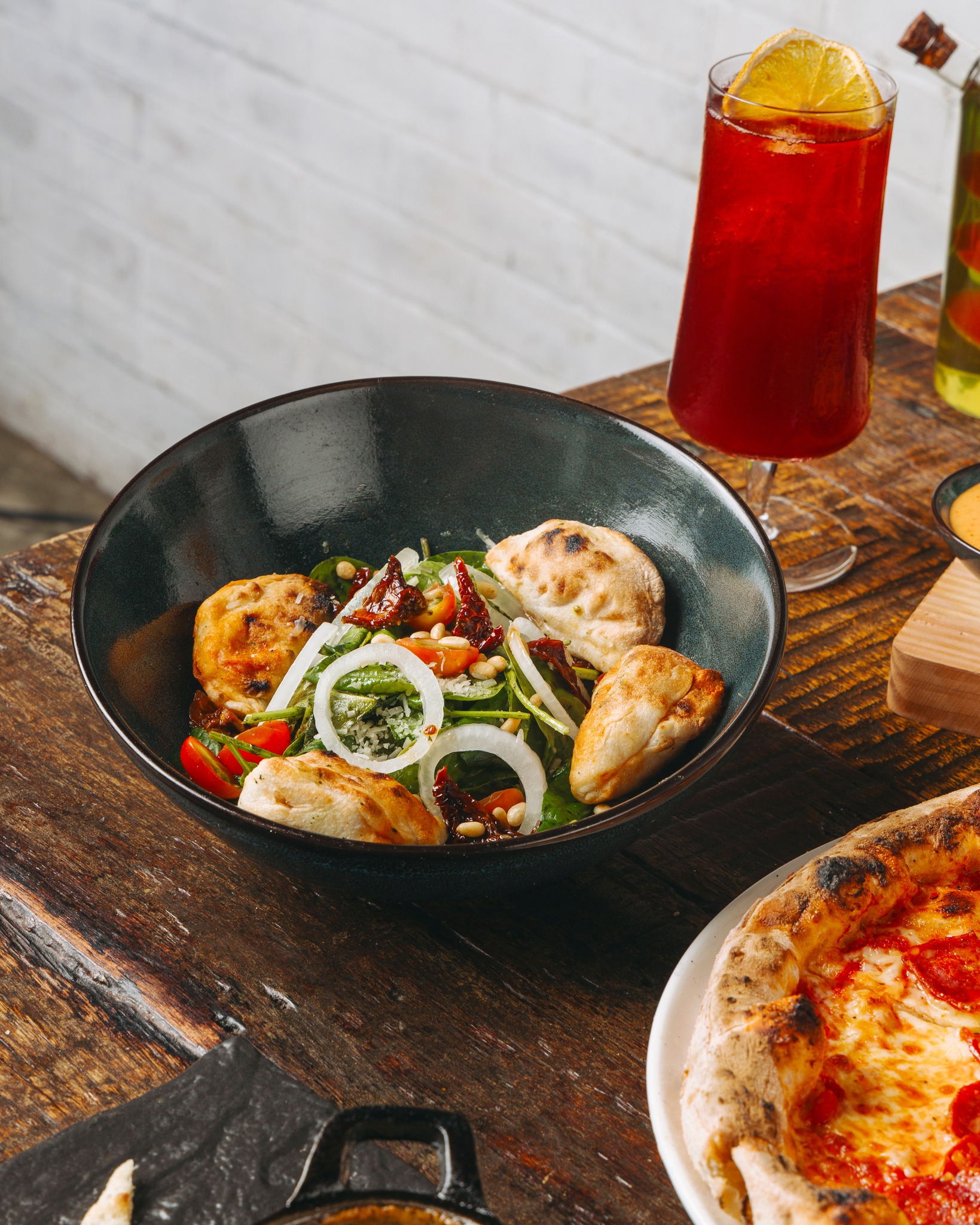 While pizza remains the highlight, the menu extends beyond it with a variety of fresh salads, pasta dishes, vegan options, and hot plate specials such as steaks, alongside a selection of sophisticated cocktails.