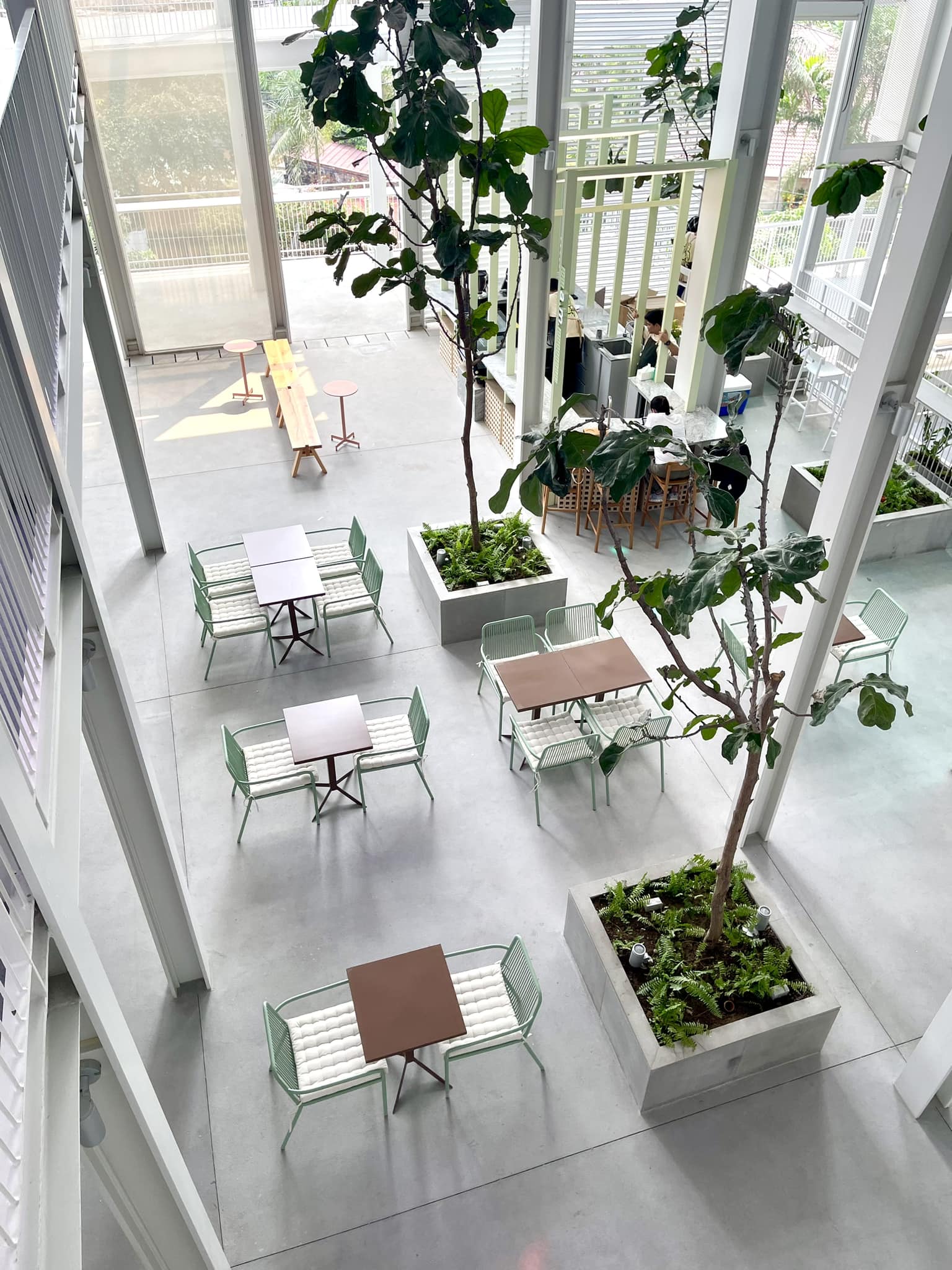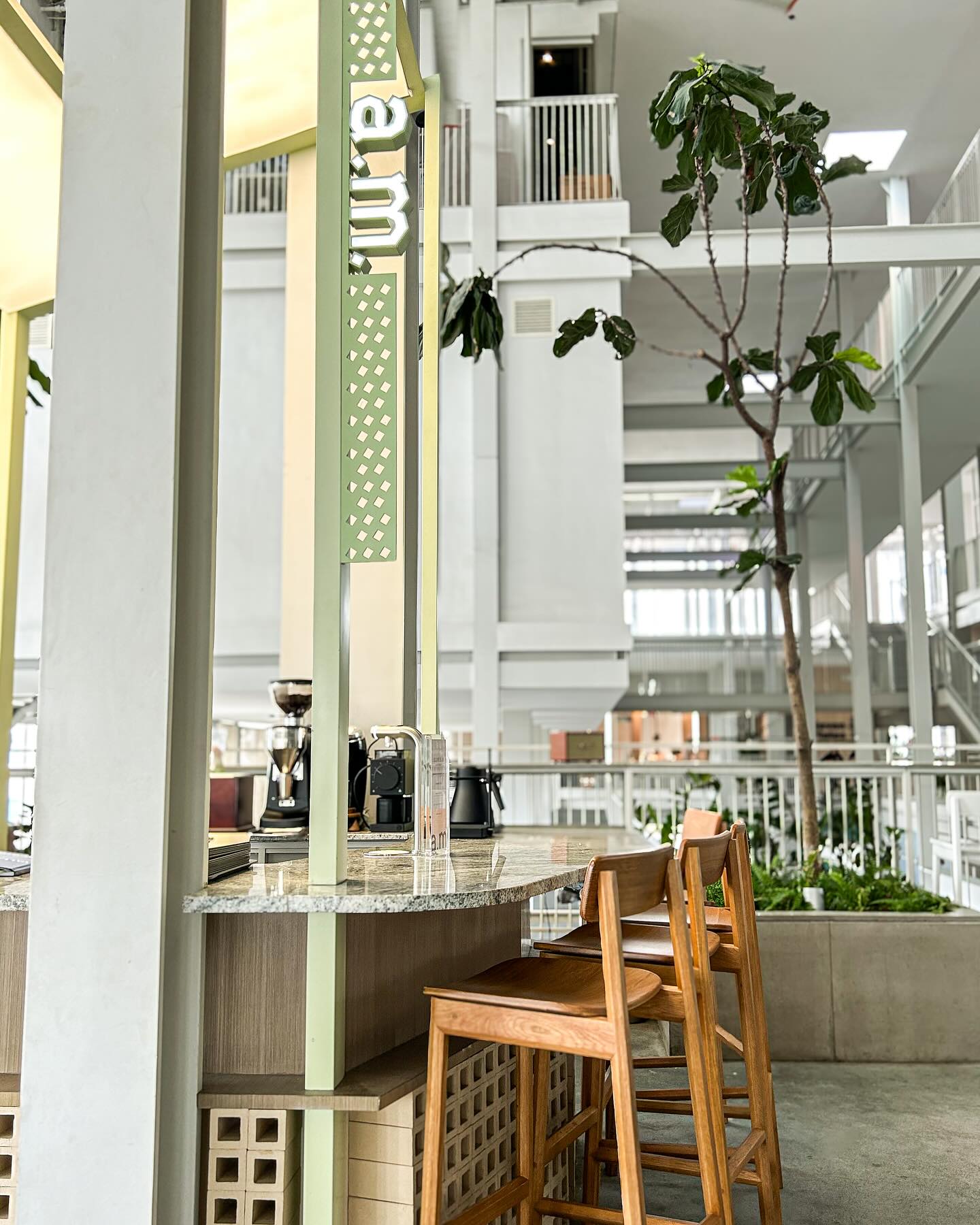 One of its most striking features is its vertical openness. The atrium-style layout makes the space feel expansive and breathable, while the uncluttered arrangement keeps it polished and serene. Mint-toned chairs, wooden tables, and natural wood stools add warmth, balancing the smooth concrete flooring and crisp architectural lines.