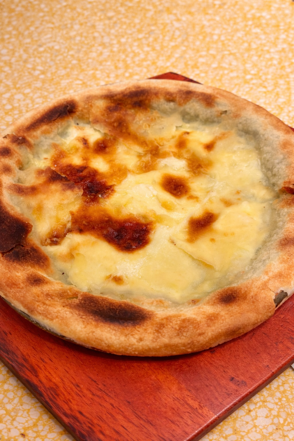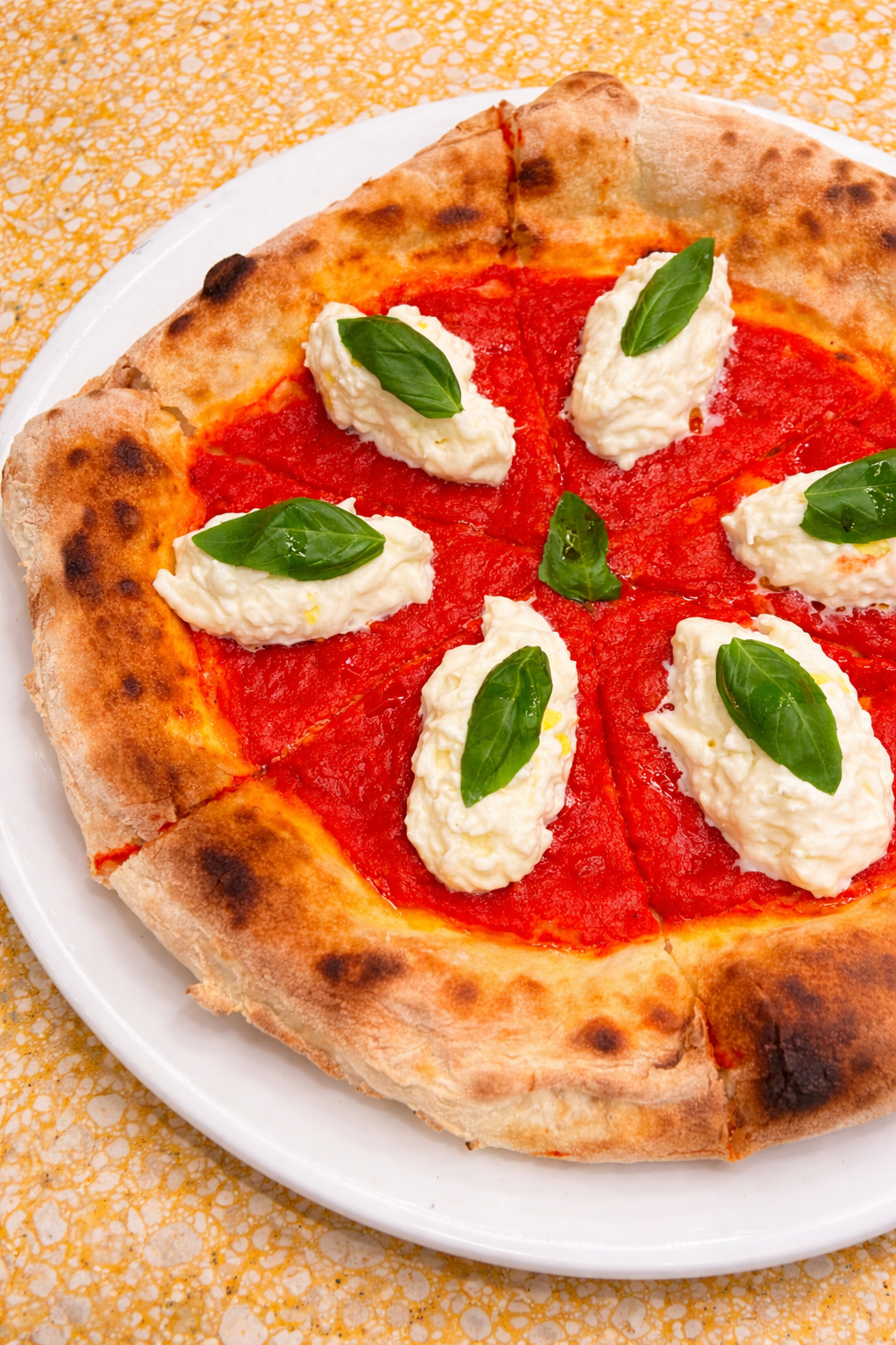 Now, on to the pizza. The Stracciatella Pizza brings together tomato sauce, cold burrata cream, basil, and extra virgin olive oil. The bright, slightly tangy tomato sauce lays the foundation, while the cold burrata cream adds a smooth and delicate richness that softens each bite.