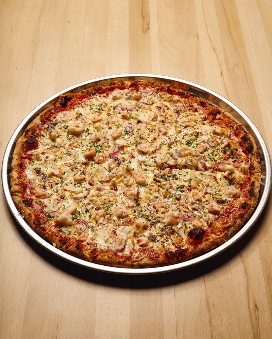 Among the popular options is the Selena Pizza (Php 1,500, 18″ Classic/Php 1,300, 18″ Tavern Style/Php 650, 12″ Classic), which features house marinara, mozzarella, garlic, red onions, prawns, anchovies, Parmigiano Reggiano, and parsley for a bold yet balanced seafood-forward flavor.