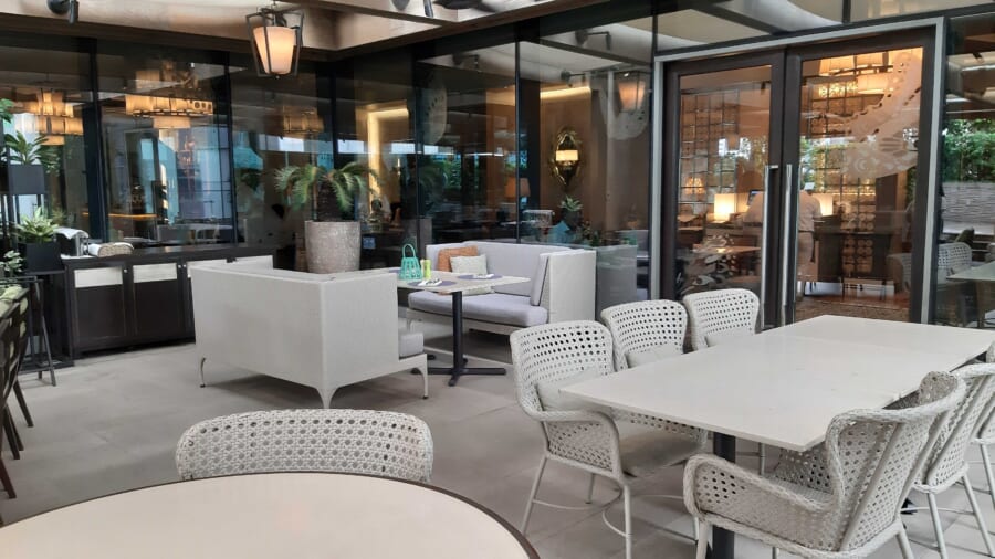 The bright, airy dining area extends to an outdoor space filled with comfortable wicker seating and lush greenery for enjoying al fresco meals. Spacious, with large windows allowing natural light to stream in, Samba’s ambiance is further improved by its stunning views of BGC’s skyline and lush poolside.