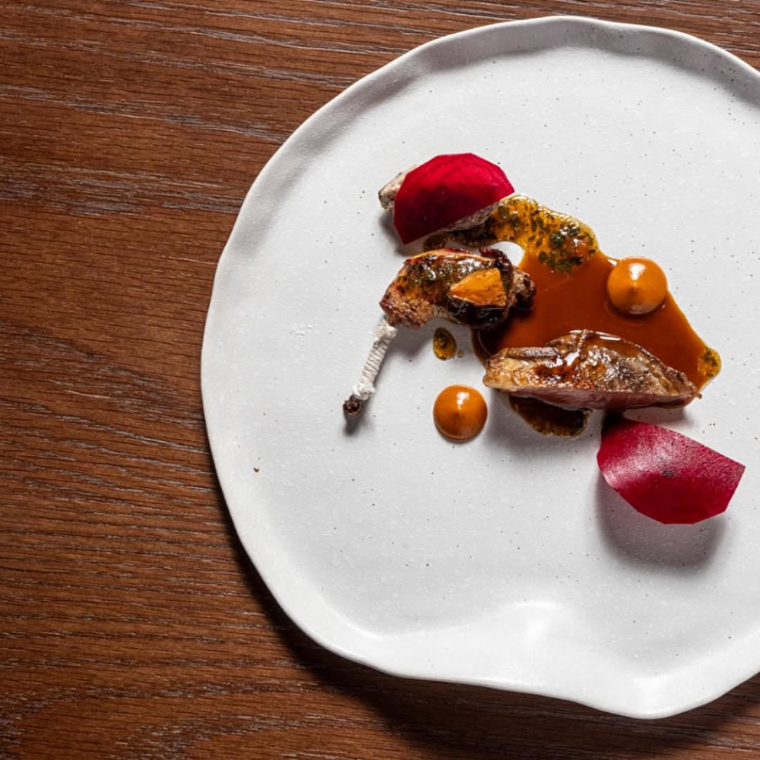 From the coast, the journey continues to the plains of Castilla–La Mancha, where game has long been a ritual of respect. The restaurant reimagines this heritage through pigeons from Tierra de Campos, roasted and glazed with a vivid orange escabeche—a pairing that cuts through the countryside with acidity and light.