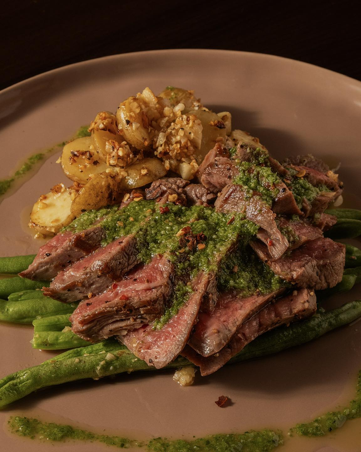 The food menu complements the bar experience with dishes that feel indulgent yet grounded. A beautifully seared Steak stands out, paired with a bold red wine that draws out every rich, savory note—simple, satisfying, and meant to be shared or savored slowly.