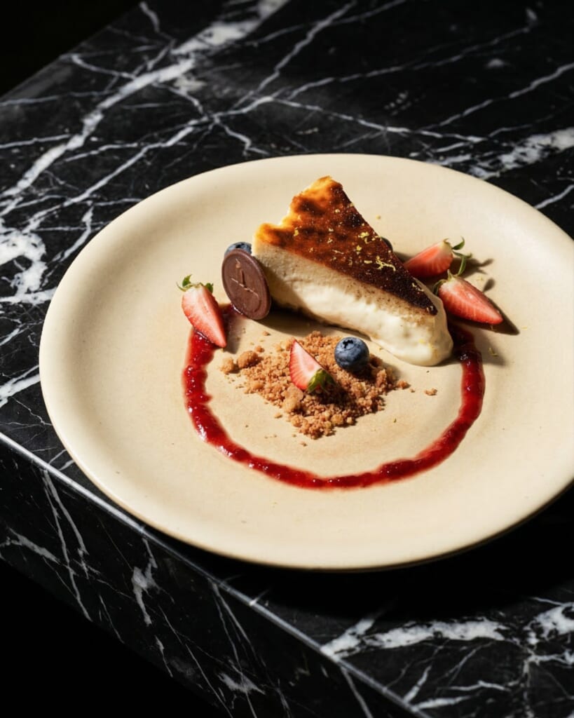 For dessert, the Basque Tarta de Queso (Php 395) presents a San Sebastián-style burnt Basque cheesecake, with a caramelized top and creamy molten center.