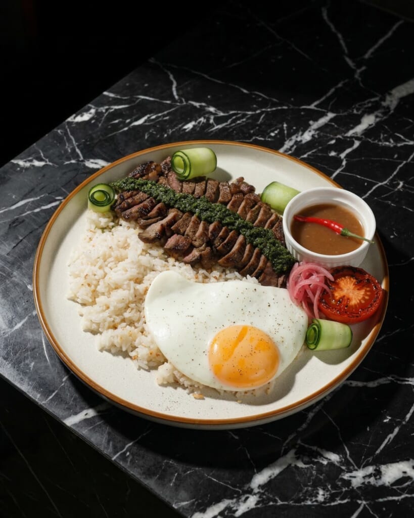 The Grass-Fed Ribeye Steak Tapa (Php 650), featuring flame-grilled ribeye tapa with egg, garlic rice, chimichurri, and house-made spiced pineapple vinegar, offering a more elevated take on a familiar silog favorite.