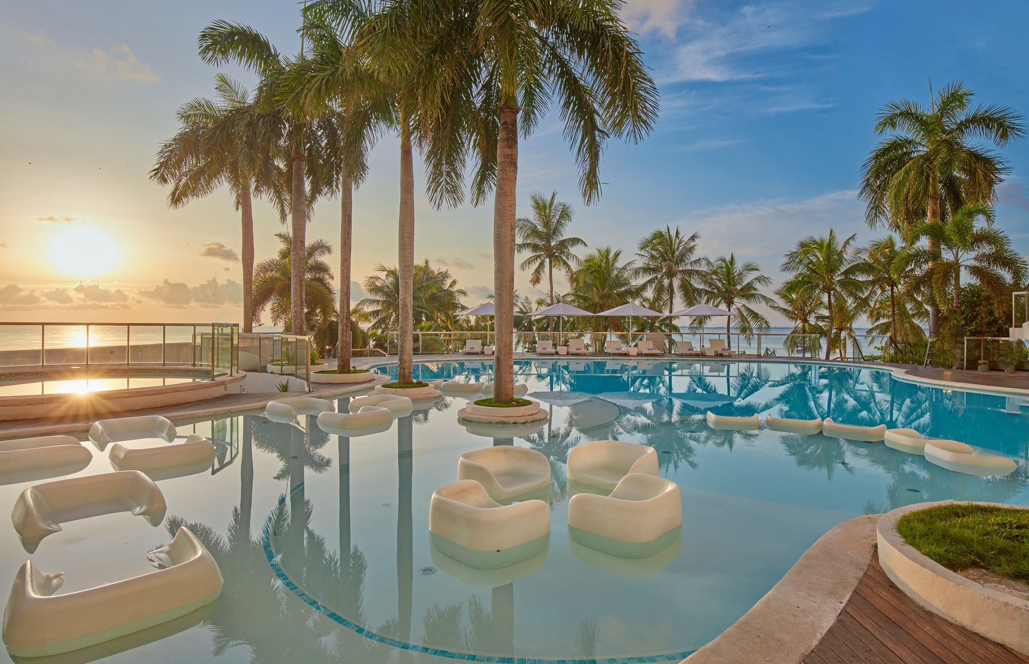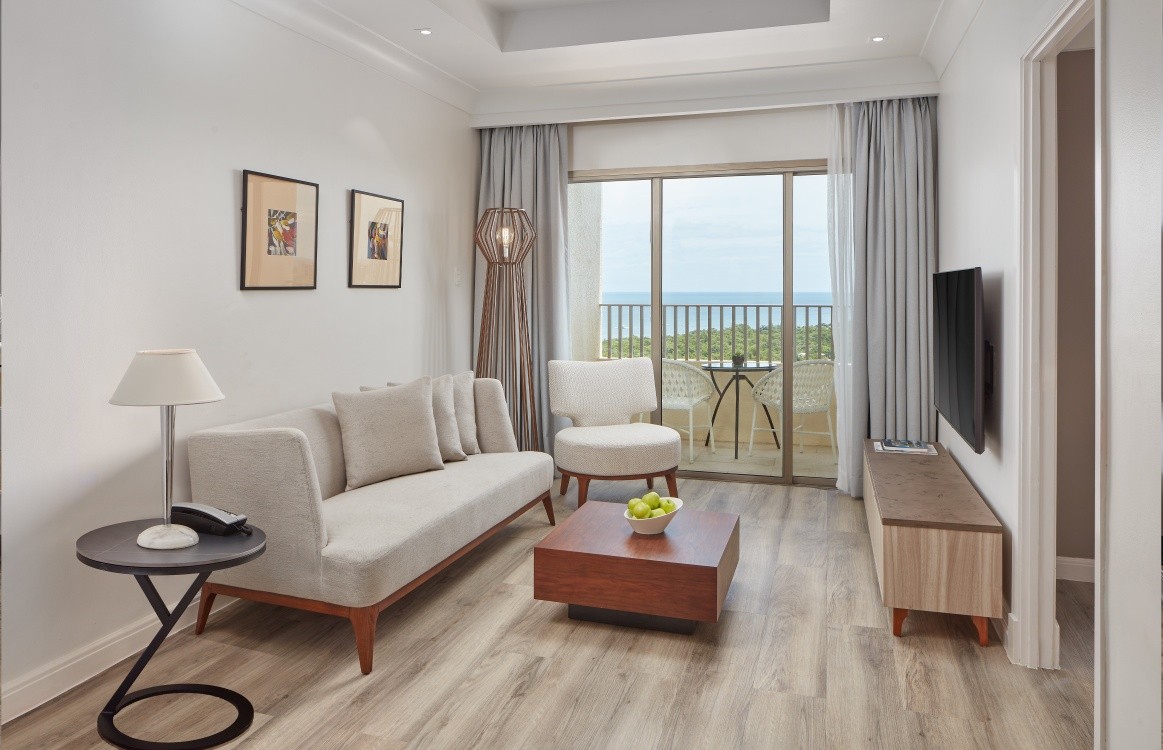 Its accommodations are designed to give guests both comfort and choice. Deluxe rooms measure around 35 square meters and come in atrium-view, seaview, and ocean-view categories, with most featuring balconies that open up to either the courtyard or the sea.